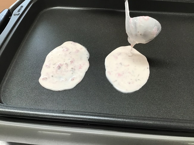ホットプレートで生地を焼きます。桜の花びらがたくさん練り込まれており、良い香りです!